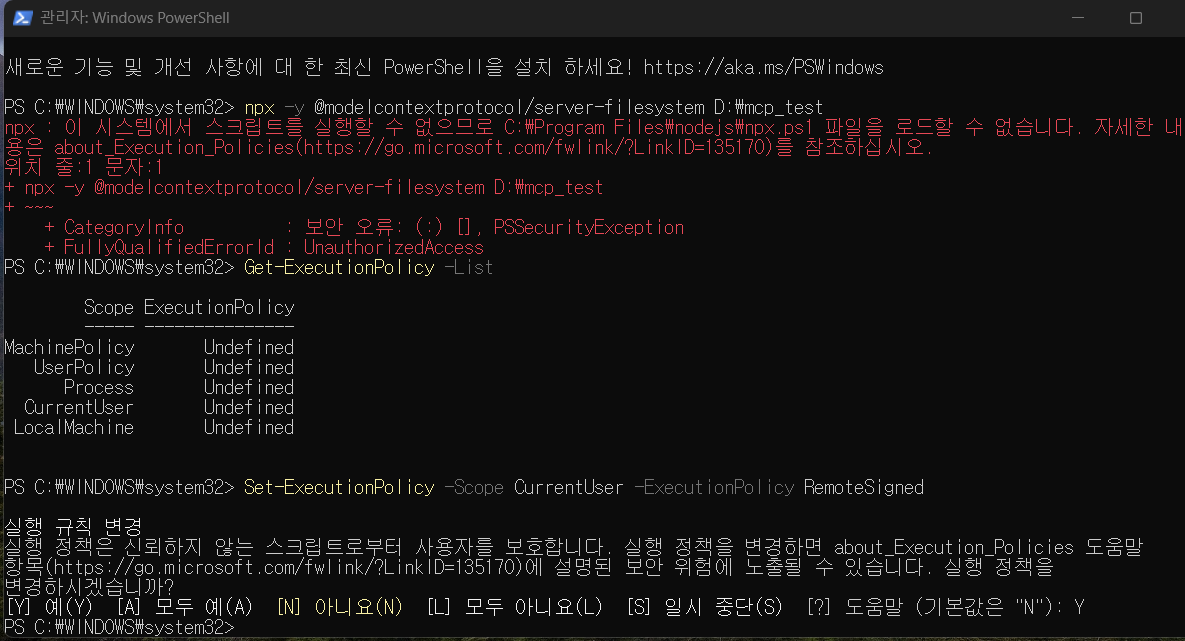 에러 나는 경우, power shell 관리자권한으로 실행후, policy 다시 설정하고 수행.