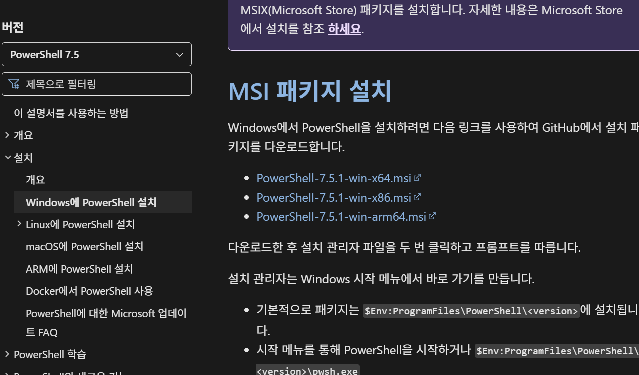 power shell 최신 다운로드 받고 싶으면, 보이는 화면에서 ctrl + 링크클릭하여 msi 파일 받아서 설치하세요.